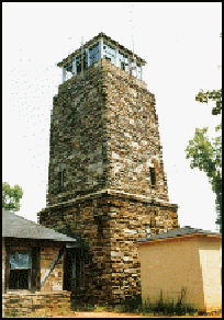 The honor of listing #250, one quarter of the way to the goal of 1,000 registrations, goes to Flagg Mountain Lookout Tower on the Weogufka State Forest in Coosa County, Alabama. Built by the CCC in 1935, the 50’ stone tower is a unique structure. The walls are 2 to 3’ thick. Large timbers were laid in the rock in a criss-cross pattern and have been replaced with inlaid stone. The 12’x 12’ cab lookout was staffed by the Alabama Forestry Commission until 1989.