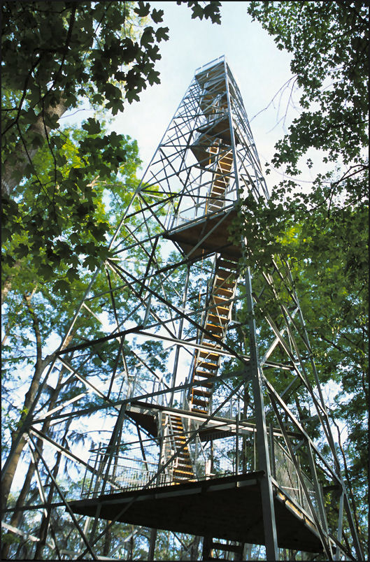 The Perry Lakes Tower was originally called the Rumley Lookout in Sumter County, erected by the CCC in late 1930s. In 2005 students from Judson College and the Auburn University Rural Studio, with help from AFC and Perry County, moved and restored the lookout to the its current home at Perry Lakes Park. The tower was reconstructed without the 7'x7' cab for the open-sky canopy effect for bird-watching. The 100' Aermotor MC-39 is now billed as the "tallest bird viewing tower in the United States."