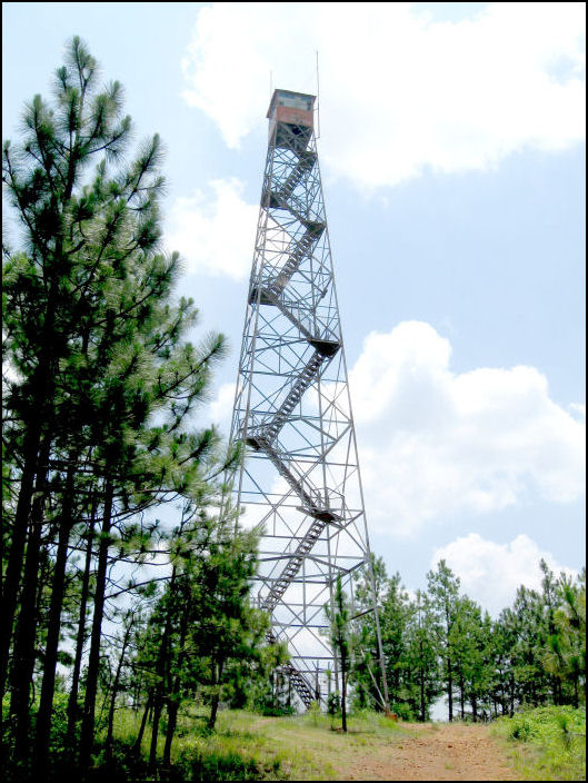 Perry Mountain Lookout on the Talladega National Forest is a 100' Aermotor tower with 7'x7' cab built by the Forest Service in 1937.