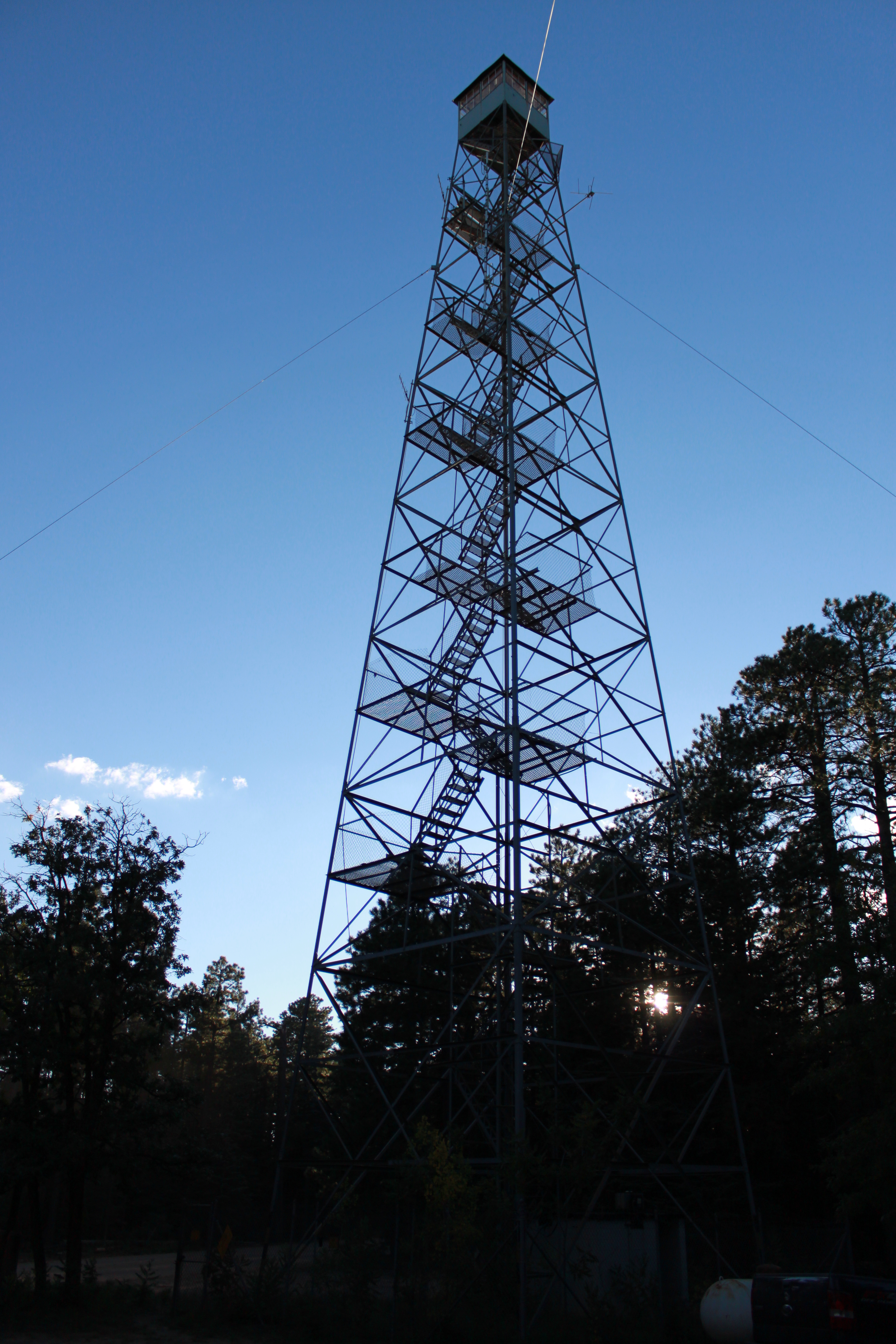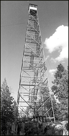 When the original 121' wooden tower was built on Promontory on the Apache-Sitgreaves National Forest in 1913 it was the highest in the U.S. Eleven years later (1924) the current 110' Aermotor with 7’x7' metal cab was erected. The original ladder was replaced with stairs in 1938. In active service, it is listed on the National Register of Historic Places.