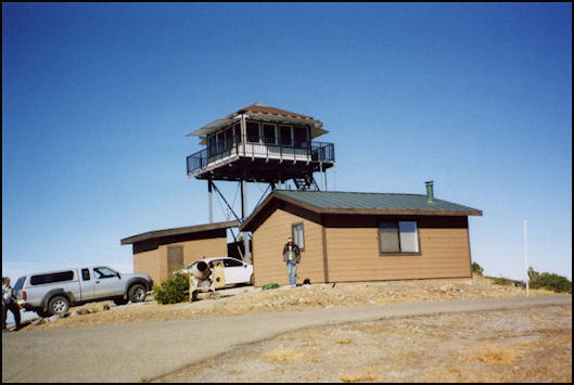 Located in the heart of the Eldorado National Forest, Big Hill Lookout is a center of fire control operations. The original 14’x14’ lookout of 1935 on a 23’ tower was burned by the disastrous Cleveland Fire of 1992. The current 14’x14’ cab with catwalk was built in 1993 along with an attractive groundhouse residence. There is also a seasonal helicopter air attack base on the site. The lookout and base are both active in fire season.