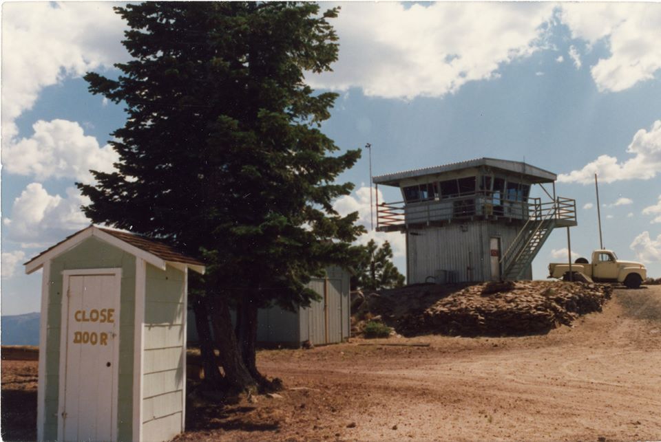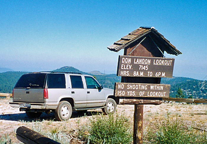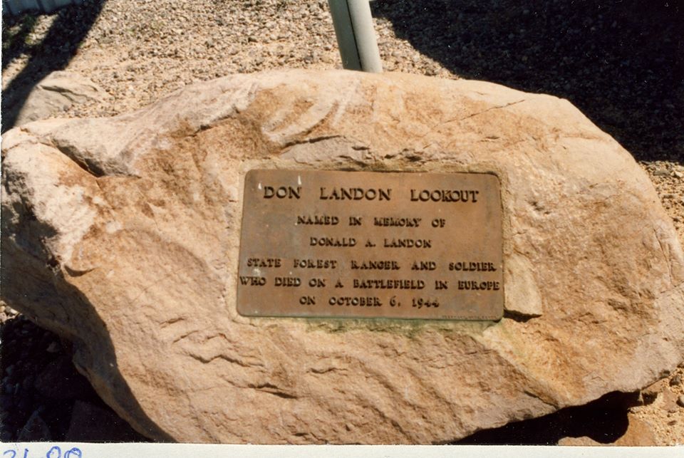 Don Landon Lookout was constructed in 1974, replaced an older structure, which had been erected in 1948. That building was dedicated to the memory of Donald A. Landon, a "State Forest Ranger and Soldier who died on a battlefield in Europe on October 6, 1944." The detection site covers territory once protected by the Shaffer Mountain Lookout Station, located east of Susanville. That lookout was closed in the early 1950s. The existing Don Landon Lookout is based on Plan Number 880-lA. The tower plan is the same as Fredonyer's. Landon's tower plans reference Plan Number 350 (Pattymocus) for cab details. The cab is essentially a 732-6A design.