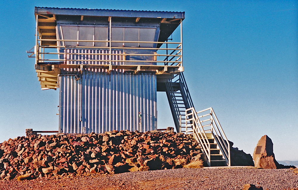 Five lookout towers have been erected using 12" diameter steel pipe for corner posts with angle iron, H-bracing and diagonal cable, X-bracing for added strength. The Fredonyer Lookout was the first to incorporate this design. As with the 732-6A style cab, this station was designed by CDF Engineer, Mike Plesha. There was a two year "test period" before additional Fredonyer style towers were authorized. (MVT 10/91)