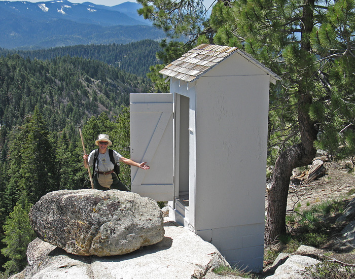 Mule Peak Lookout was built in 1936 at a cost of $2,800. It is a C-3 14' x 14' wooden groundhouse with catwalk. Reached only by trail in the Sequoia National Forest, all the materials were delivered by mules and horses. Updated with solar power and single pane windows, it remains in active service.