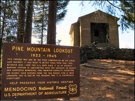 Built on the Mendocino National Forest in 1933, Pine Mountain Lookout is a BC-201 lookout-fireman cabin with windows on three sides covering a 180 degree viewing area. In World War II it was an aircraft warning station. Recently restored, it is now in the rental system.
