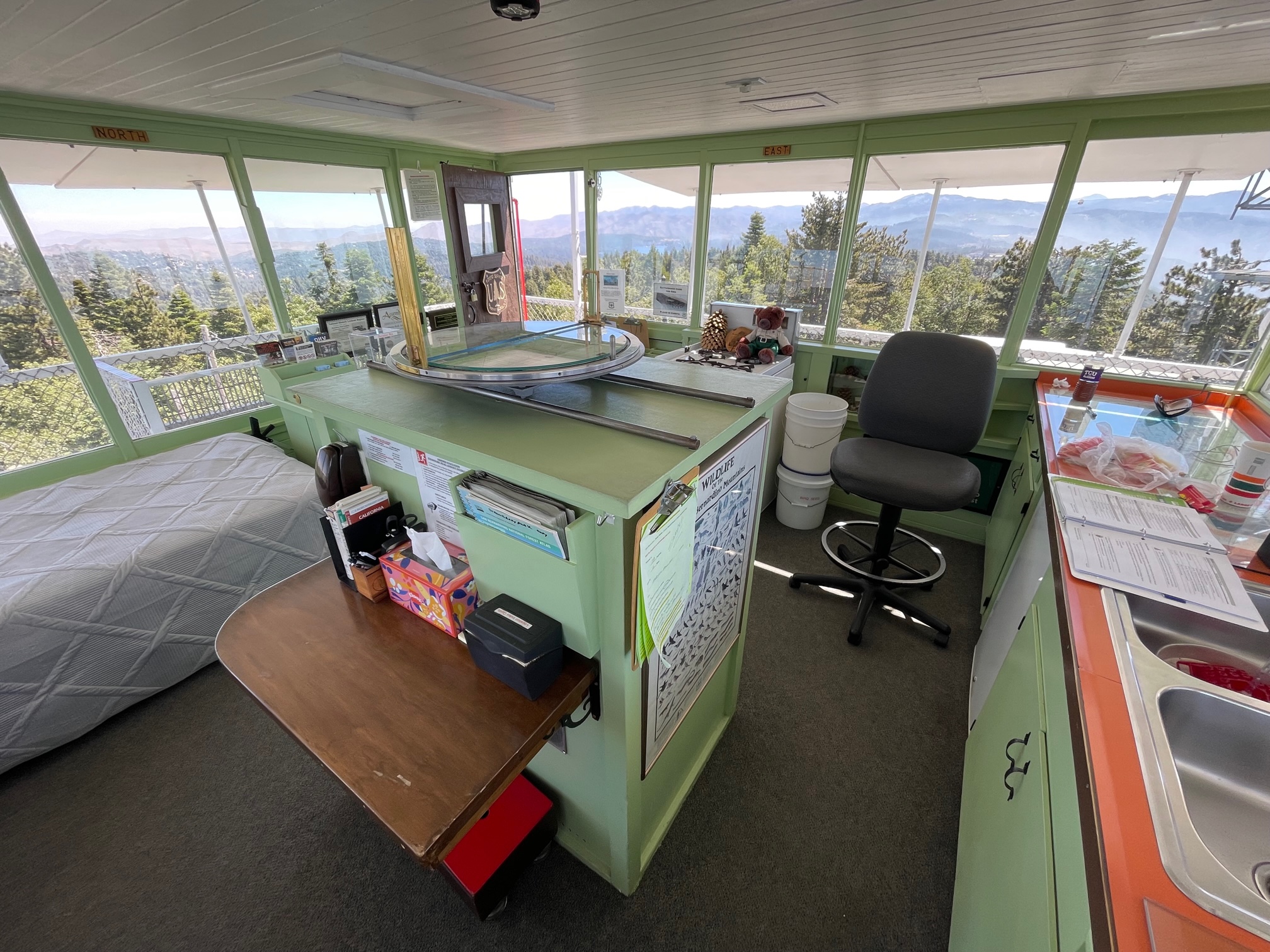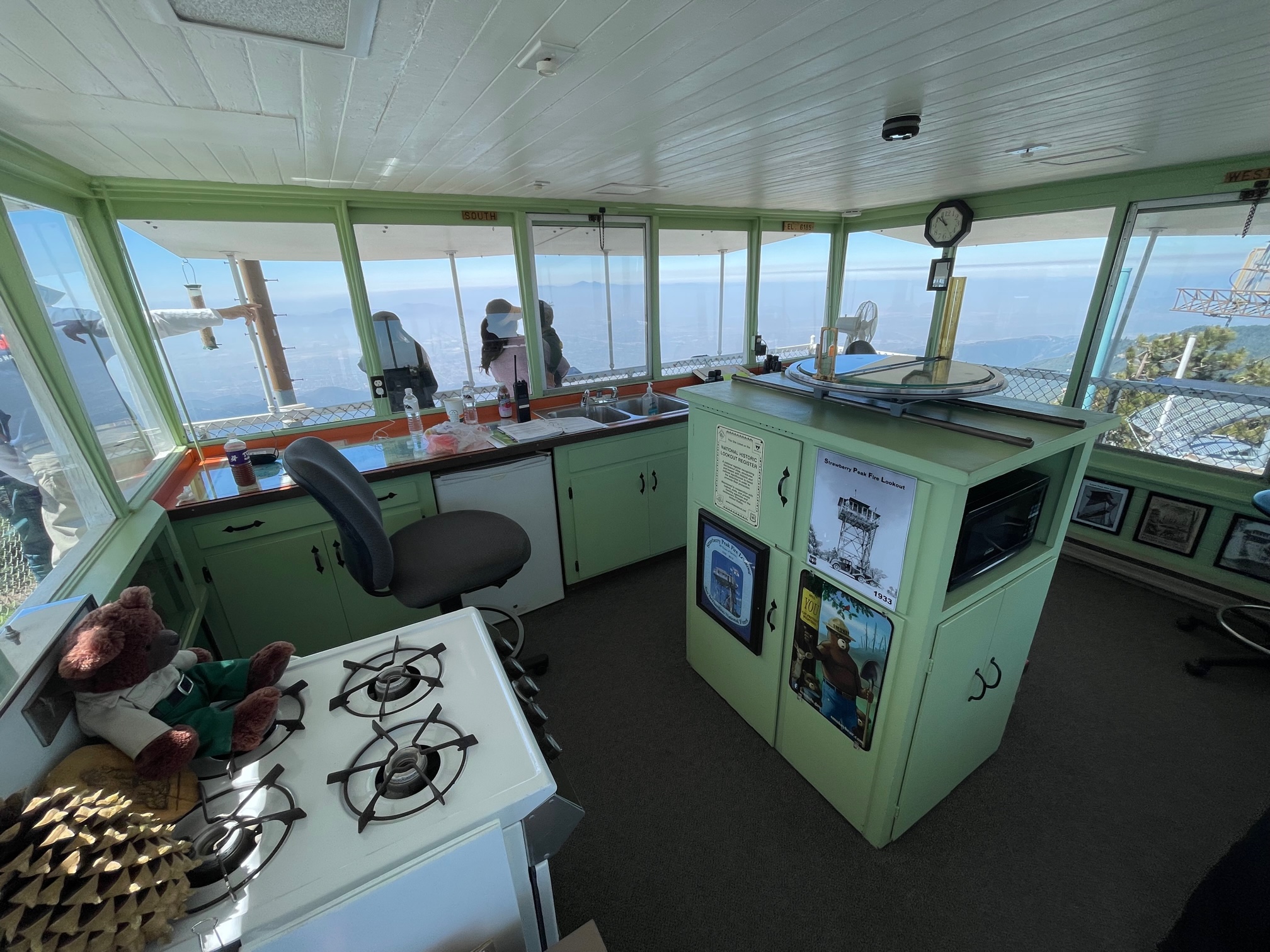 The cab is an R1/L-1 14’ x 14’ cab on a 30 foot K-Brace steel tower, located near an electronics site. From Memorial Day to Labor Day (later if the weather is dry) it is staffed by Southern California Mountains Foundation Fire Lookout Volunteers.