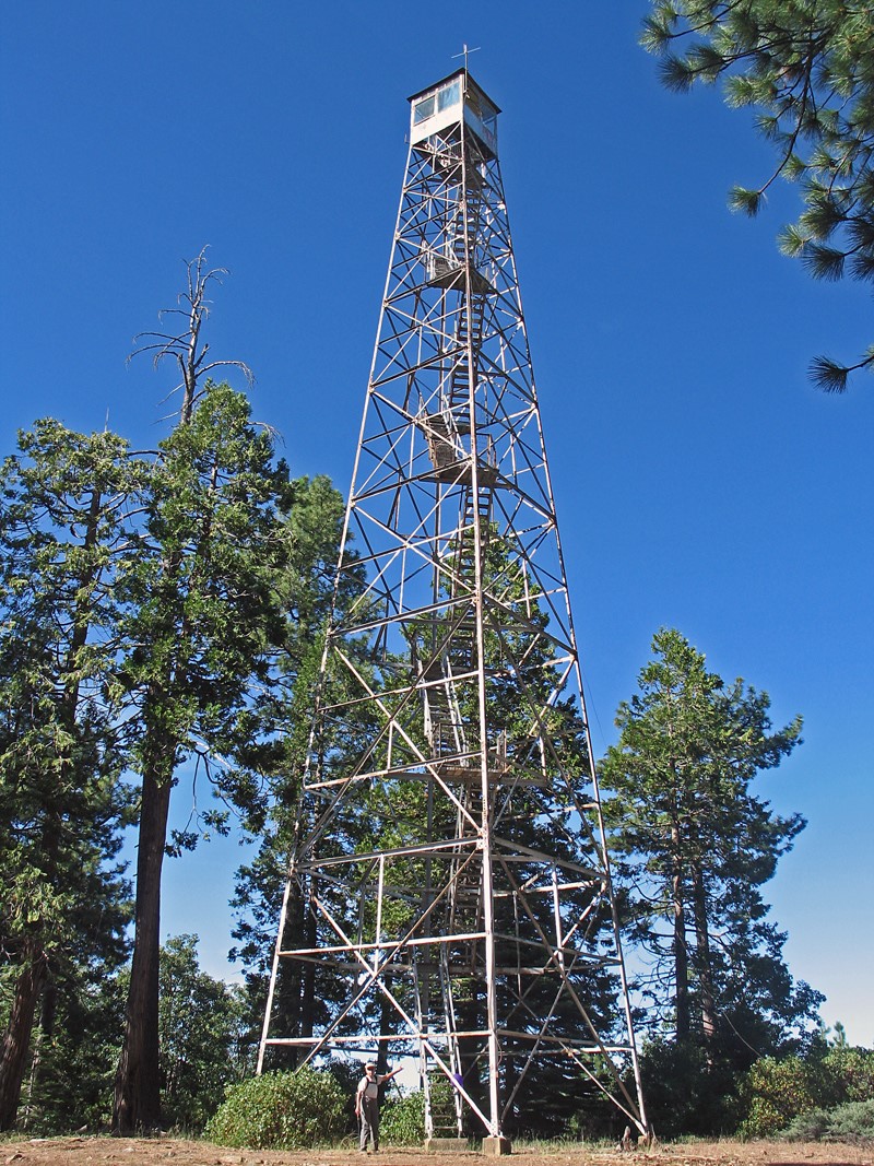 Groveland Ranger District, 5,999' elevation. The CCC built Woods Ridge Lookout in 1939. The tower is 100 feet tall with a 7-foot square observation cab. The Aeromotor Company designed both the cab and tower. The steel lookout replaced a treetop lookout built by the Forest Service in 1913 as a crow's nest at the top of a 100' yellow pine that had been donated by the West Side Lumber Co. A residence and garage are at the lookout site. Woods Ridge has not been staffed since the 1970s. Along with Duckwall, this is one of the two tallest lookouts in California.