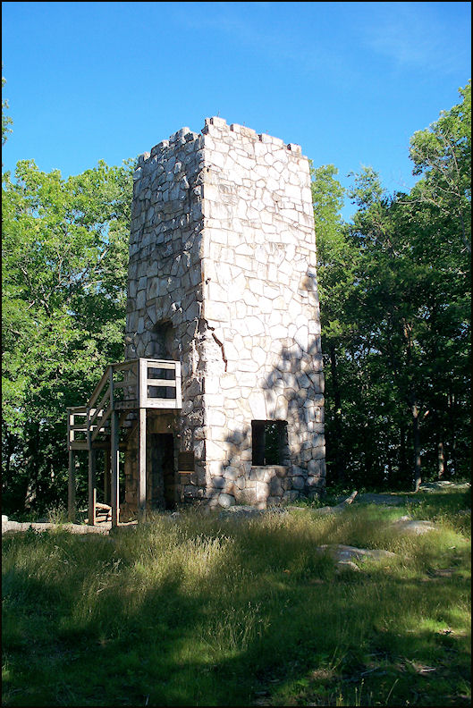Built by the CCC in 1938, this 50' stone tower originally had a top made of wood and glass, which was was burned by vandals in the early 1970s. The original top was rebuilt as part of a restoration around 2018.