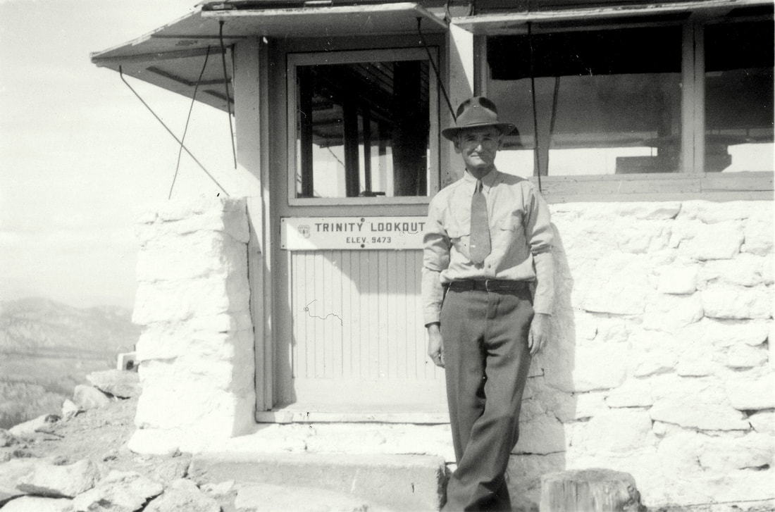 Trinity Mountain has hosted a lookout since 1922. A 12x12 stone cabin first, later replaced by an L-4 cabin on a 10 foot concrete block tower.