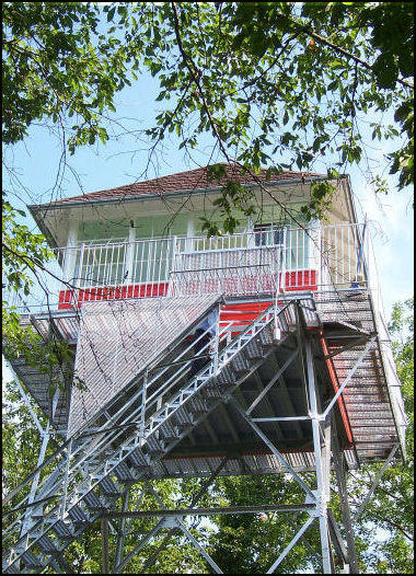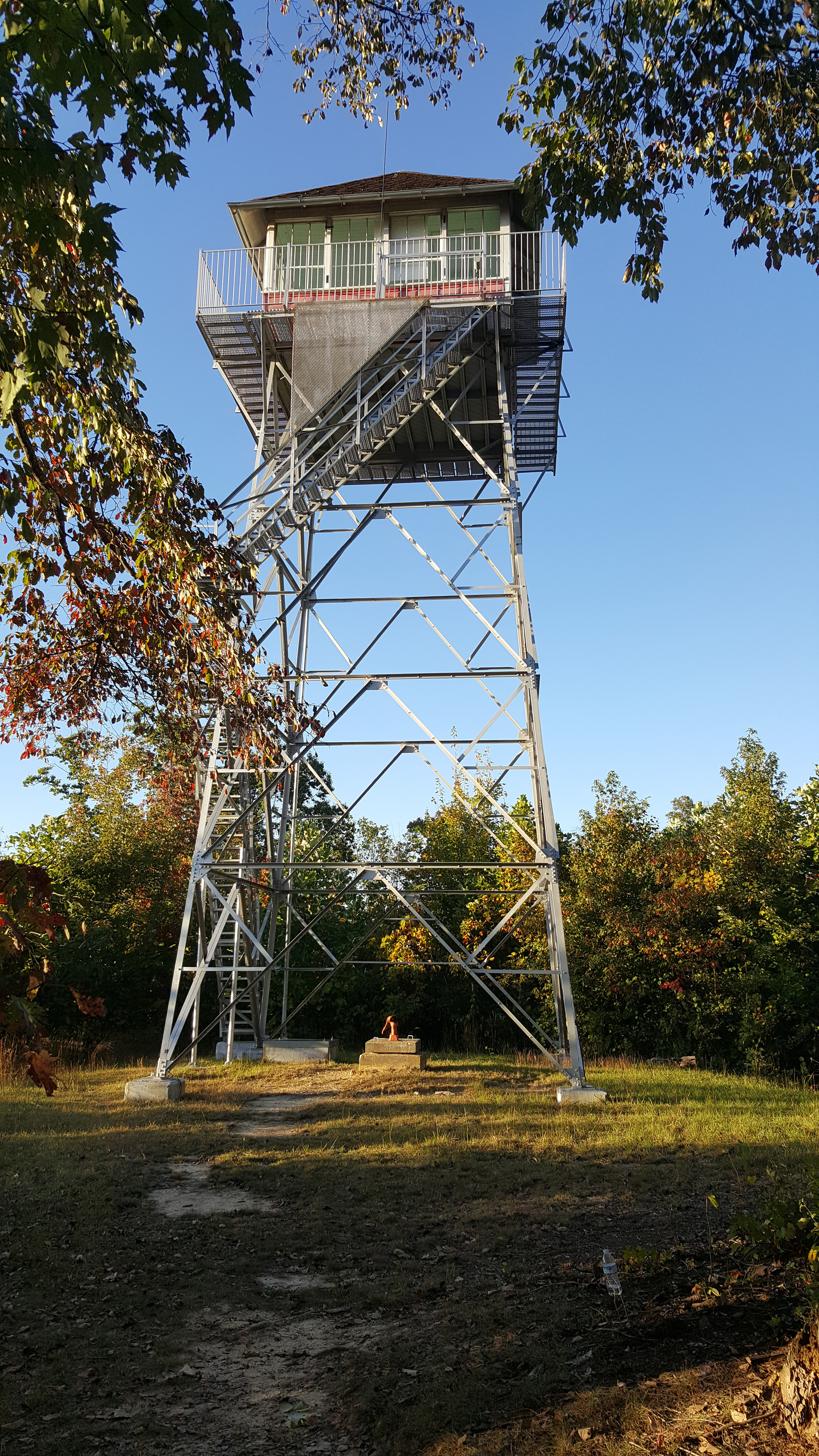 Pinnacle Knob Lookout, a USFS R-8 model 14’x14’ live-in cab on a 40’ steel tower, is the last of its kind in Kentucky. Built by the CCC in 1937 on the Cumberland Falls State Park, it overlooks a part of the Daniel Boone National Forest. Restored in 2008, it is a state park historic site.