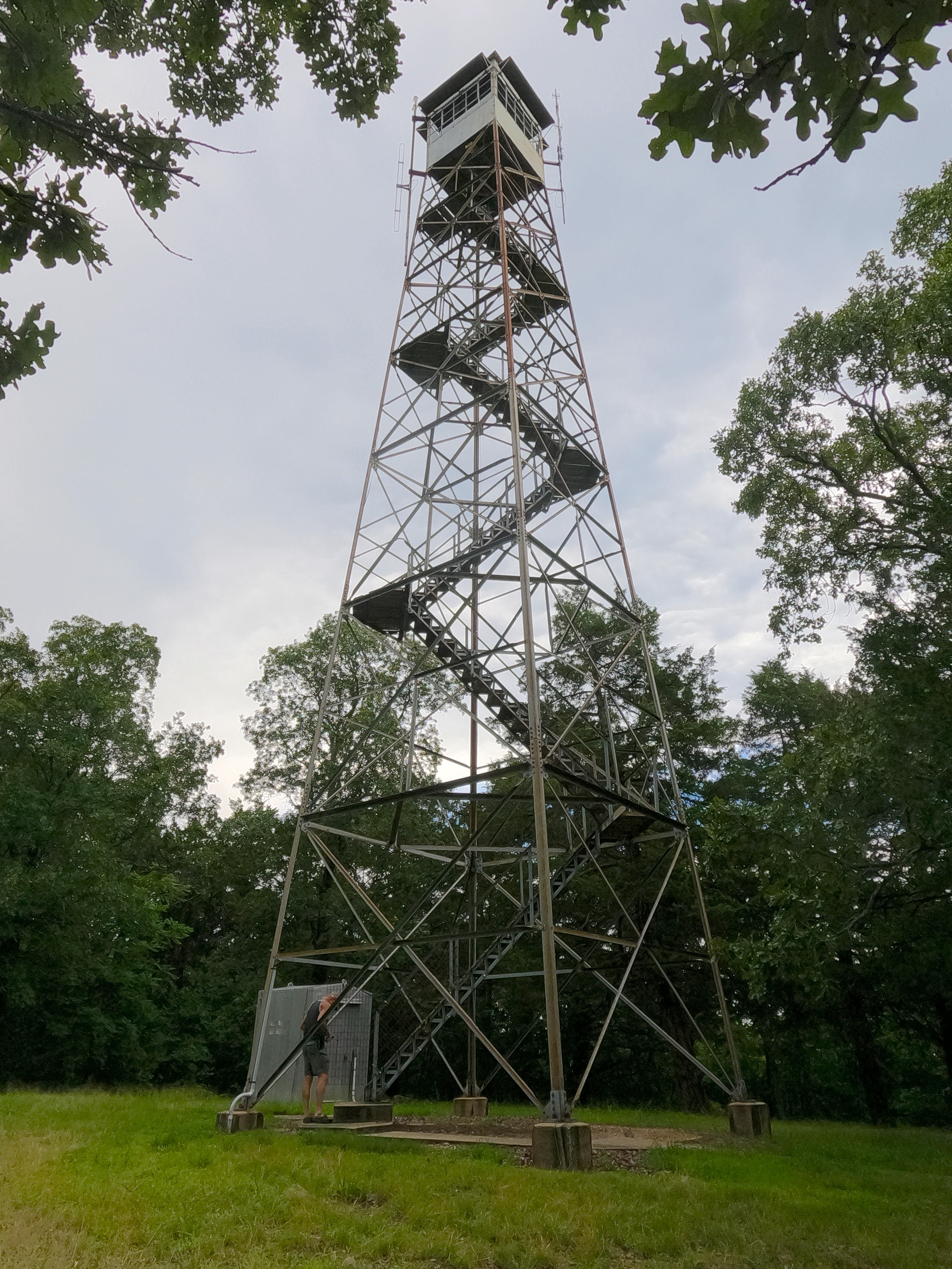 The tower steps as of July 2024 are in an older but functional state. From the top, the tower has views of the hills surrounding Eminence to the west, and the Current River water channel between two hills to the east.