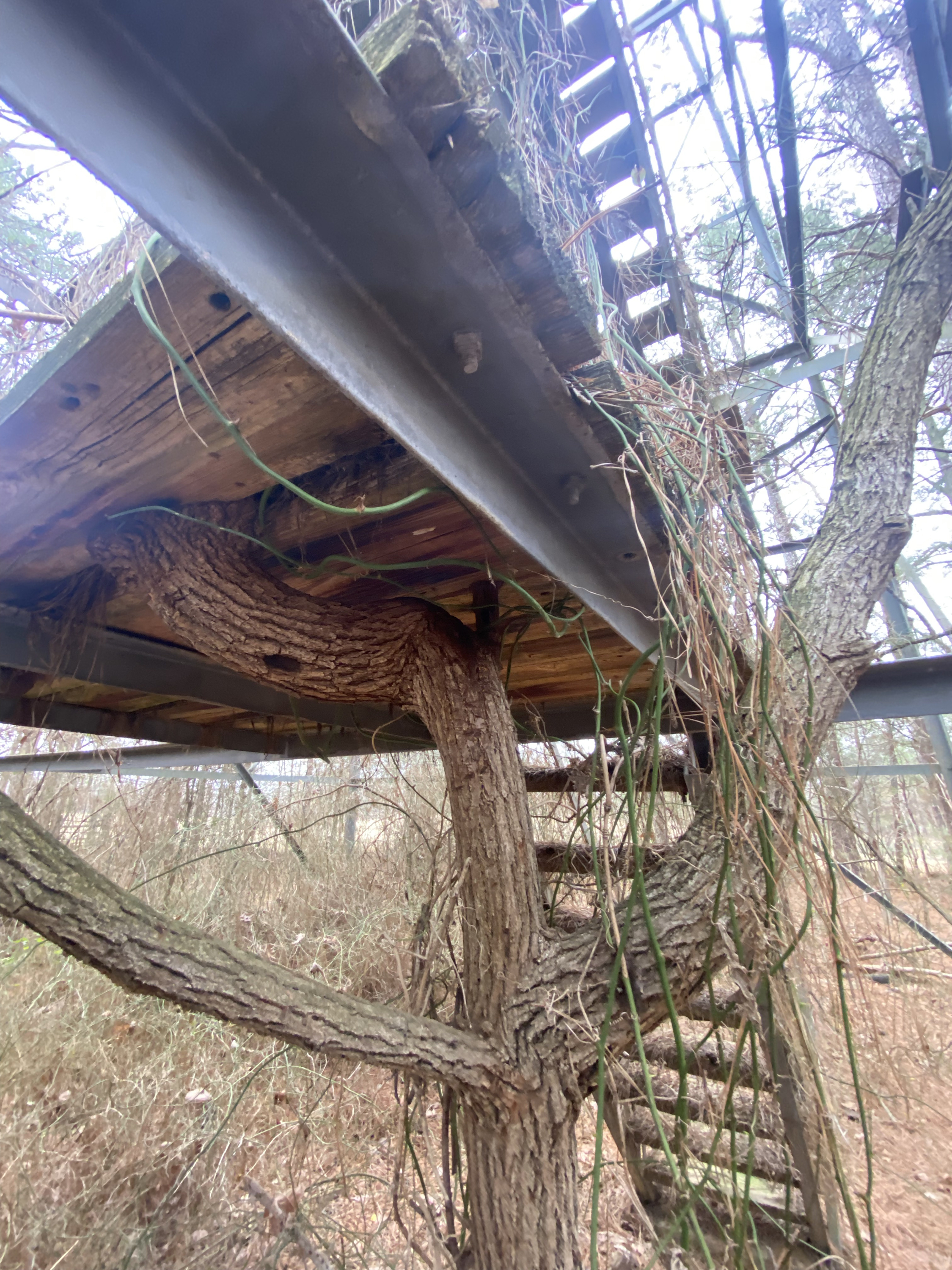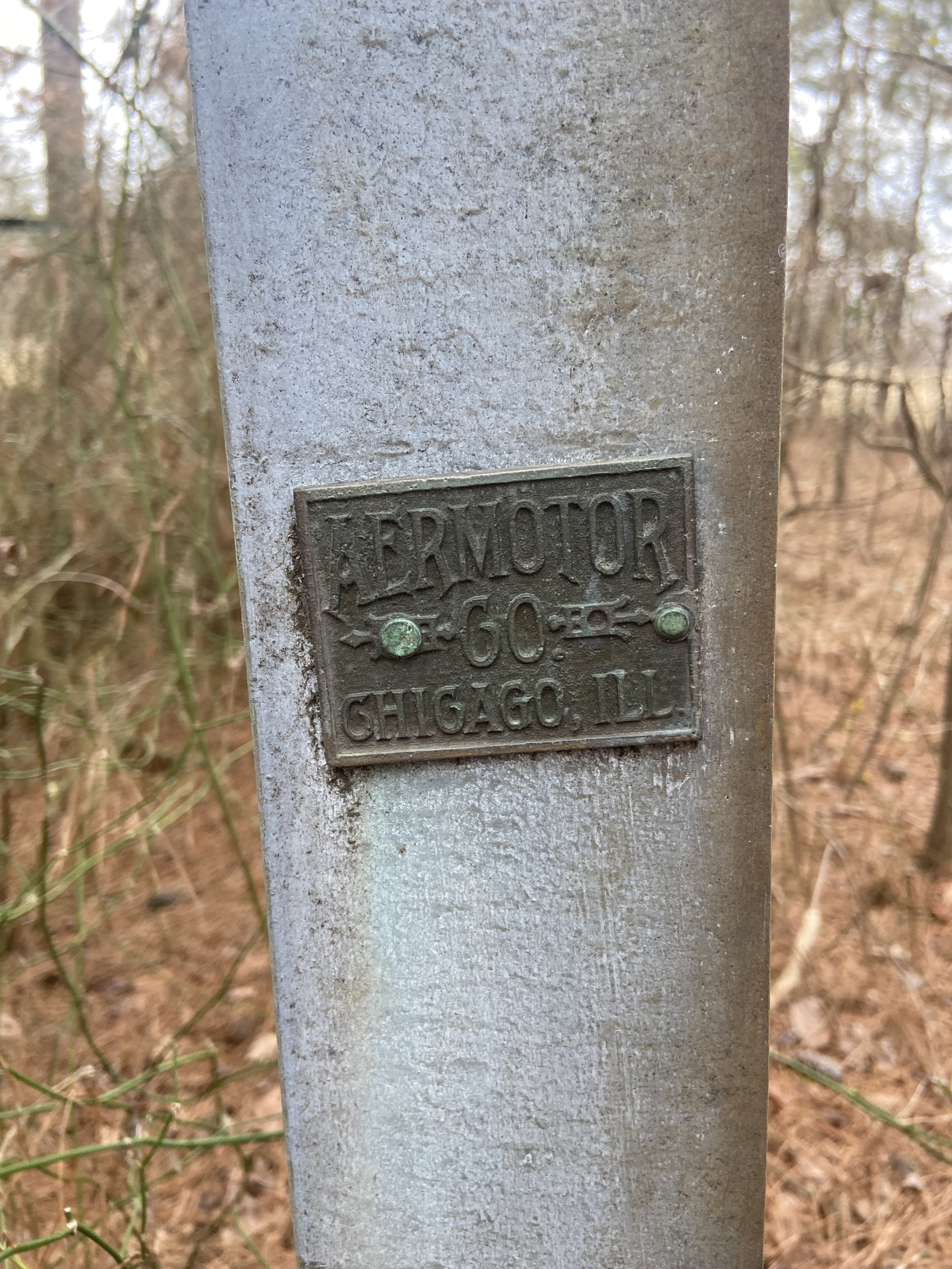 A typical 100ft Aermotor tower that's tucked away in a grove of pine trees. This site would be next to impossible to access during the spring or summer months due to the the amount of vegetation that has grown around the tower base.