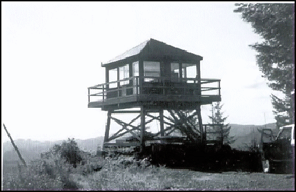 Former lookout Gary Wilson has contributed the following information: "I manned this lookout in the summer of 1951. At that time I believe it was an L4 type cab. The usual paned windows were present and the shutter assembly opened up for shading. It was a brand new lookout which allowed me to do some painting and trimming of Douglas Fir trees felled to improve the view. In 2001 or so I visited the site and found the cab to look similar to the photo. There may have been a lookout structure at site before the current structure. A friend of mine served as a lookout the previous summer living in a tent near the site with an Osborne situated outside on a large log. He joked that he wore out his shoes on one side due to the steep slope he was working on. The current structure was built during this time and into the Fall of 1950."