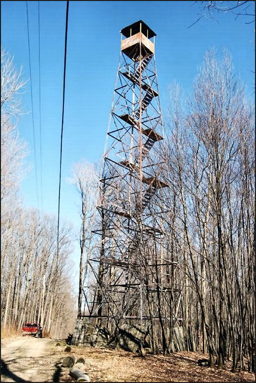 This Aermotor LS-40 tower with 7'x7' cab was originally constructed by the Pennsylvania Bureau of Forestry in 1925 as a 60' tower and located on land approximately 1/2 mile from the present location. It was relocated to its present location and raised to 80 feet in 1932 after a dispute with the landowners of the original site.