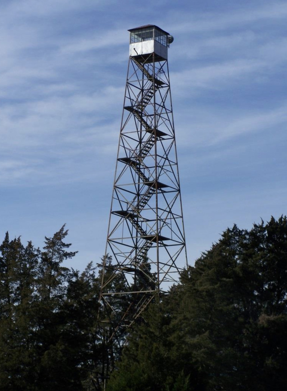 From a 2014 historic survey by King William County: “The fire tower is a tall tapering metal truss structure with a square plane metal frame lookout cab at the top. The lookout cab is clad with metal sheeting and features multiple- light metal fixed windows across each elevation. The lookout cab has a pyramidal roof covered in seamed metal and is accessed by an open metal staircase located within the metal truss structure. The King William Fire Warden position was created in 1933 and the first fire tower was constructed shortly after.”