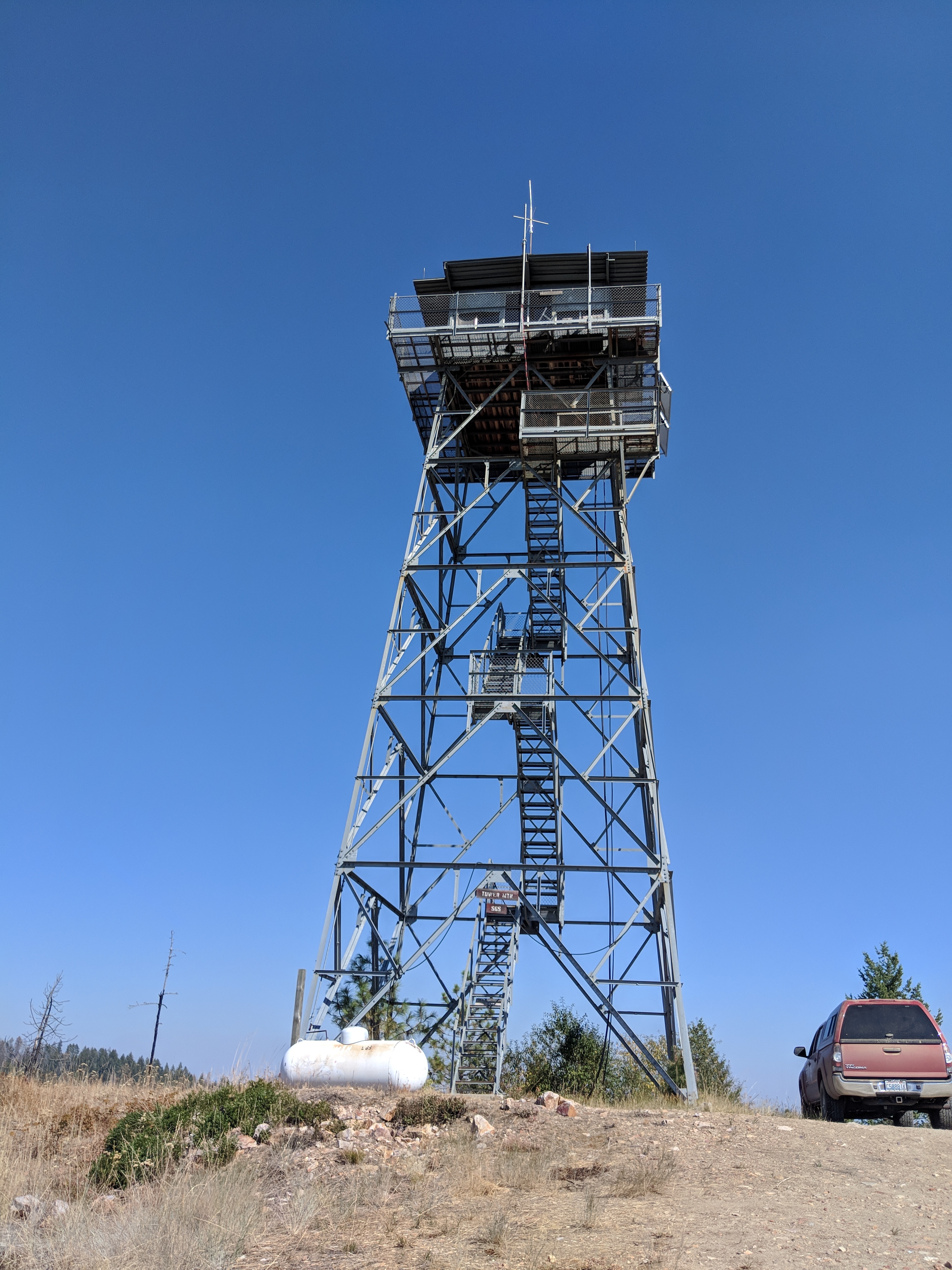 Located in the Spokane Indian Reservation, this is 53-foot steel live-in tower was built in 1975. It is staffed every summer. It is the first tower at this site. Signs in route indicate the location as Lookout Mountain but a sign on the tower says Tower Mountain. A nearby hillside is higher and the obvious high point.