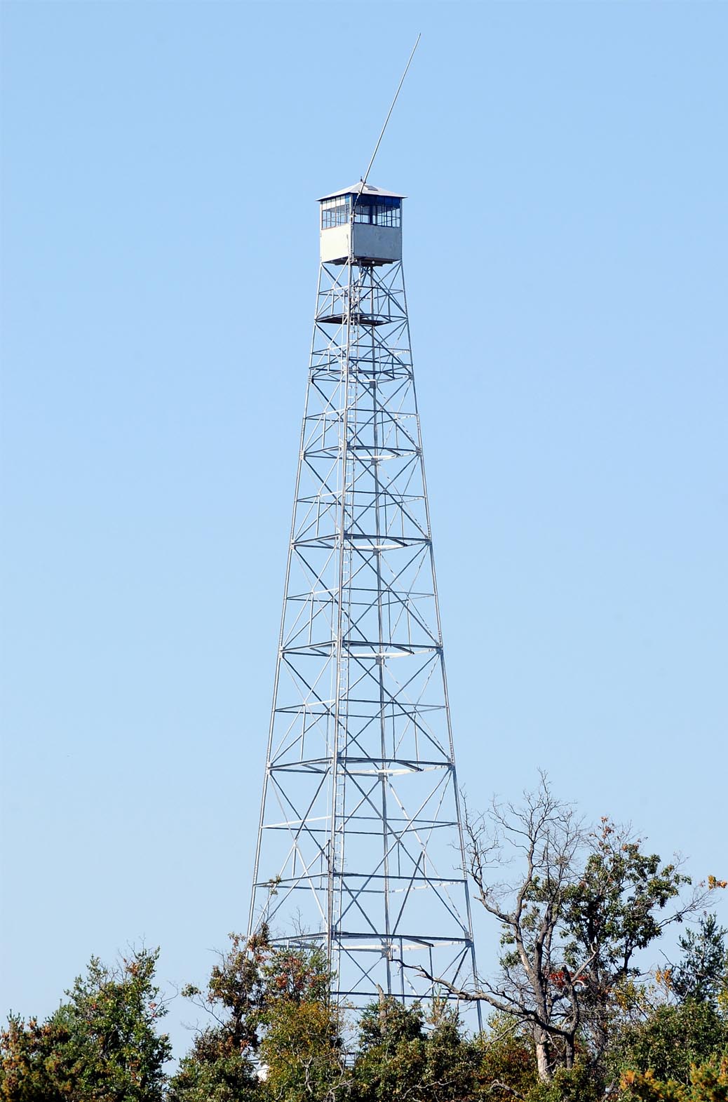 This 100-foot USFS style tower features an inside corner ladder and was manufactured by Bethlehem Steel. It was built in 1932.