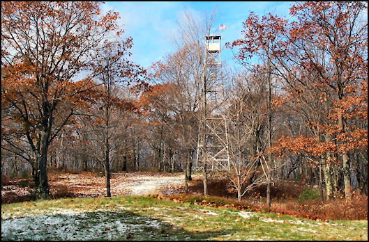 This is the third site that this fire tower has stood upon. In 1928 the Taconic State Park Commission erected the Aermotor LS-40 60' tower on Alander Mtn., just barely within the Commonwealth of Massachusetts, for the sole purpose of detecting fires on park land. In 1930 the area at Alander Mtn. burned, and the land owner asked for the tower to be removed. The tower was dismantled by Park staff and stored at the High Falls facility in the park. The Park re-erected the tower on Washburn Mtn., within the park boundaries, in 1933. Operation of the tower was turned over to Forest Fire Control about 1935 and was actively operated there until 1963. In November of 1963 the tower was dismantled by Forest Rangers and transported by helicopter to the Beebe Hill site and re-erected. The tower was actively operated at Beebe Hill until it was closed in 1987.
